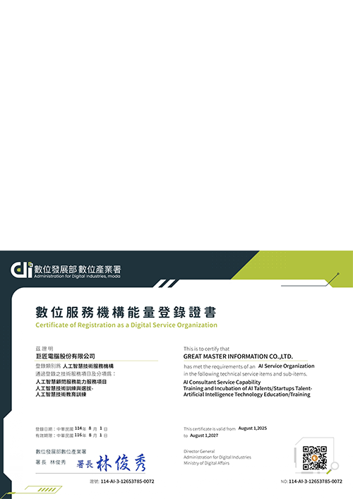 在 AI 驅動的競爭時代,企業需要的已不再是單點技能,而是能夠「看全局、懂工具、會跨域」,具備高度彈性與連結性的人才團隊。巨匠企業培訓的願景,是成為企業的人才策略引擎,協助您打造能持續成長的「人才韌性」。