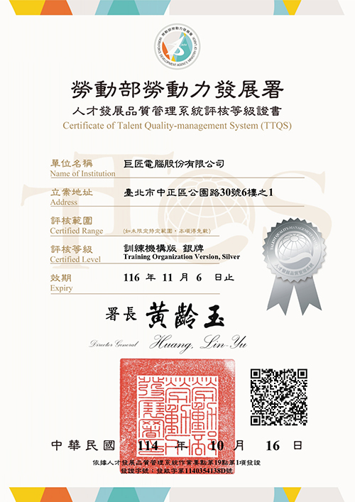 人才培訓品質勞動部 勞動力發展署人才發展品質管理系統 (TTQS) 銀牌