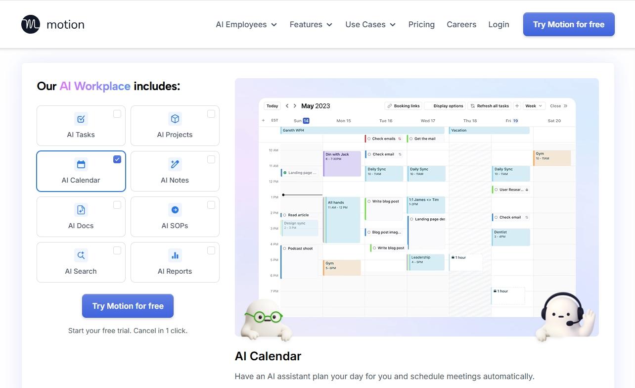 Motion是一款專為日程安排與任務自動排程設計的AI行事曆工具。不僅整合Google Calendar等多種行事曆,還能根據任務優先順序與行程自動調整每日安排,如同一位私人AI秘書替你規劃和優化工作進度。